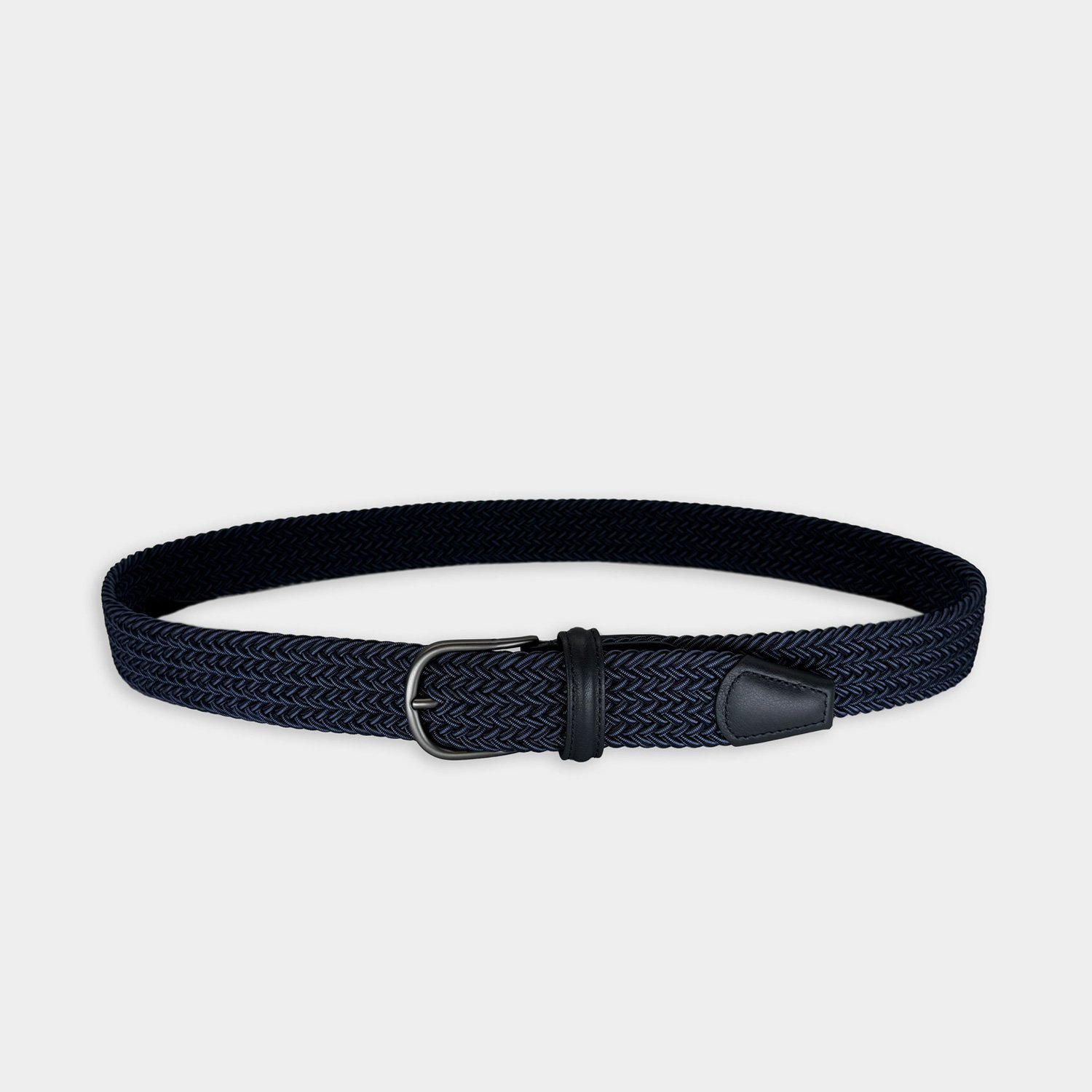 Anderson’s – Handgemaakte gevlochten stretchriem met donkerblauwe lederdetails en zilverkleurige gesp.
