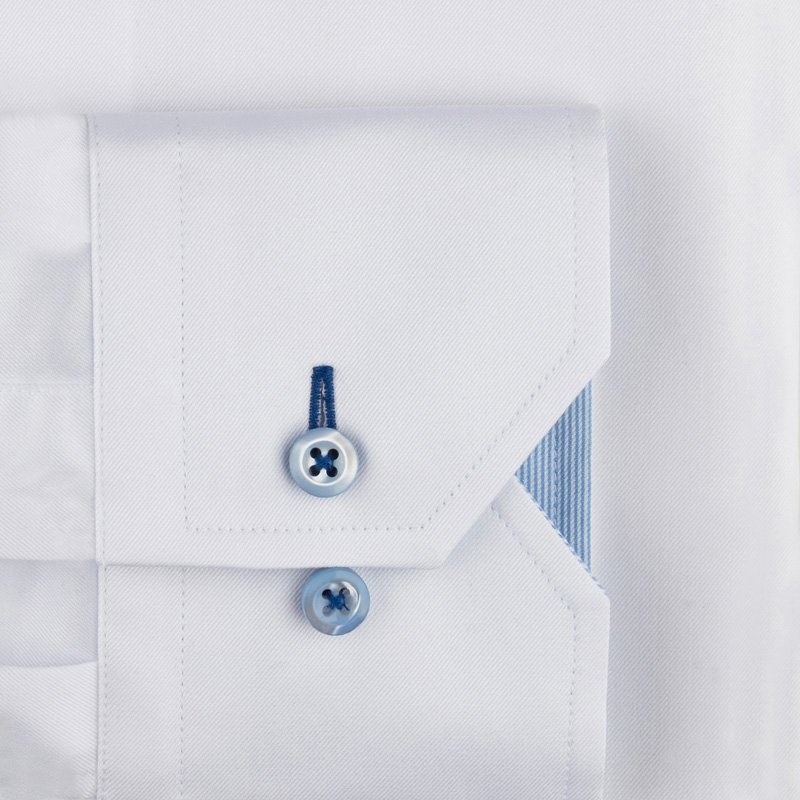 Dit witte slimline overhemd is gemaakt van tweevoudig superkatoen voor een slanke pasvorm. Het heeft een blauw gestreepte contrasterende details en navy lijkt rond de knoopsgaten. Afgewerkt met enkele manchetten, blauwe luxe parelmoer knopen met navy x-stitch en een gematigde cut away kraag. Dit veelzijdige item ziet er geweldig uit in een pantalon of los gedragen met denim.